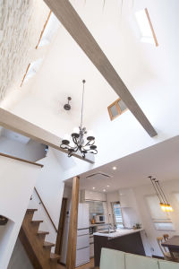 奥様のご実家を譲り受けリフォームを計画されたK様。構造部分までかなり老朽化が進んでいたため、建替えをすることに。新しい住まいのテーマは、奥様ご希望の「フレンチハウス」。リビングには大きな吹き抜けを設け、2本の化粧梁と間接照明でさりげない上質感を演出。壁と天井は素朴な質感で、調湿機能にも優れた漆喰壁とし、吹き抜けの壁は陰影が美しいブリックタイルを採用しています。足元もボルドーパインの無垢フローリングと、自然素材をふんだんに盛り込んだ贅沢な空間に仕上げました。