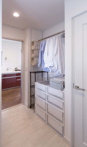 職場に近い、利便性の良い中古住宅を購入したA様。「最小限の間取りで暮らしたい」とのことから、1階は和室を撤去し、寝室となったワンフロアの開放的なLDKに改装しました。水廻りは廊下からLDKへ回遊できる動線を確保。ご夫婦の希望で、洗面室横にはウォークインクローゼットを設置。棚板やポールはDIYによって取り付けた、ご夫妻の合作です。キッチンやクロスのあざやかな色が、空間に個性をプラスしています。