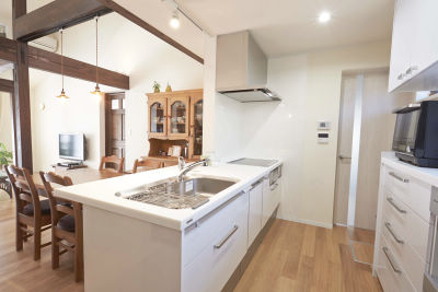 築100年のK様邸。使い勝手に不便を感じていたため、思い切ってリフォームすることに。一番のご希望は、長年住まいを支え続けてきた梁組を活かしたレトロ感のある住まいでした。そこで、隠れていた柱や梁をあらわしに。重厚感ある木目の味わいに、自然素材の塗り壁が美しいコントラストを生みました。インテリアや照明は、奥様が大好きだとおっしゃるアンティーク調に統一。和と洋の古き良き魅力が調和した住まいが生まれました。