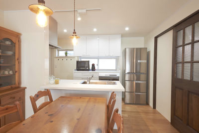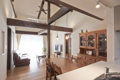 築100年のK様邸。使い勝手に不便を感じていたため、思い切ってリフォームすることに。一番のご希望は、長年住まいを支え続けてきた梁組を活かしたレトロ感のある住まいでした。そこで、隠れていた柱や梁をあらわしに。重厚感ある木目の味わいに、自然素材の塗り壁が美しいコントラストを生みました。インテリアや照明は、奥様が大好きだとおっしゃるアンティーク調に統一。和と洋の古き良き魅力が調和した住まいが生まれました。
