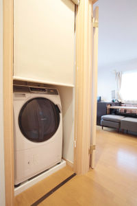 洗濯機置き場は動線を遮らないロールスクリーンを採用。
