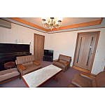応接室の壁が柄入りのオレンジ系で圧迫感がある。ドア色も重い。