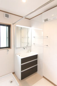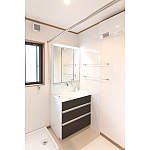 洗面ドレッシングは、奥まで取り出しやすいパノラマスライドを採用。ハンガーパイプを設置し、お洗濯も便利に。