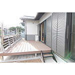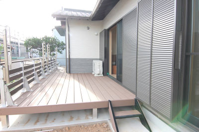 LDKを出ると、広々としたウッドデッキへ。洗濯物をしっかり干すのに最適。夜はお酒を楽しむ憩いの場。
