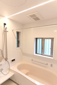 間取りの変更により、1216(0.75坪)から1616(1坪)にサイズUP。白を基調とし、窓も2ヶ所設け、明るい浴室になりました。