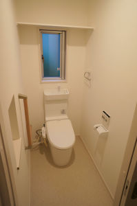 スペースを設けて圧迫感の無い、ゆったりとした暖かなトイレになりました。 安全性も考慮し手摺も設置。
