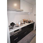 キッチン、水廻り、内装のリフォーム。 キッチン等の水廻りはシックな色目を使う事で落ち着いた雰囲気に変身。 また、約10帖に広くなった洋室には施主様ご希望のエコカラットを2面に張りワンランクUPした空間に仕上がりました。