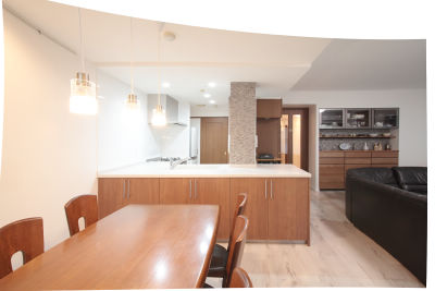 お子様が独立されたことをきっかけに、お部屋をつなげて広々とした空間にしたいとご希望されていたM様。キッチン横には移動できないパイプスペースは、天然石貼りの重厚感あふれるシンボルタワーとしました。カウンターも広いリビングが見渡せるL字型の対面式に変更。キッチン背面の壁面収納にはタワーと同じ天然石を取り入れ、空間に統一感を与えています。