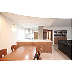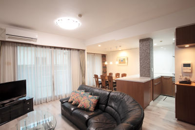 お子様が独立されたことをきっかけに、お部屋をつなげて広々とした空間にしたいとご希望されていたM様。キッチン横には移動できないパイプスペースは、天然石貼りの重厚感あふれるシンボルタワーとしました。カウンターも広いリビングが見渡せるL字型の対面式に変更。キッチン背面の壁面収納にはタワーと同じ天然石を取り入れ、空間に統一感を与えています。