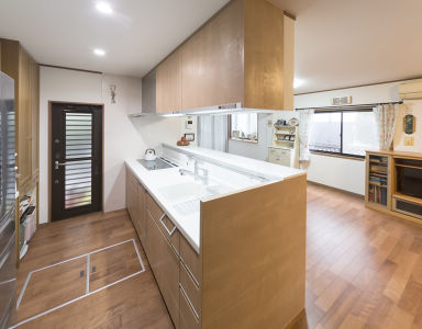 定年をきっかけに「明るく、風通しの良いLDKにリフォームしたい」とご希望されていたF様。壁付けだったキッチンは勝手口のある対面式に変更。ダイニングスペースを拡張し、天井には自動開閉式の天窓を設けることで、光が降りそそぎ、風の通り抜ける心地よいLDKが生まれました。明るく心地よいお部屋でご夫婦での会話も弾むと、奥様も納得の仕上がりとなったようです。