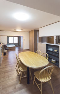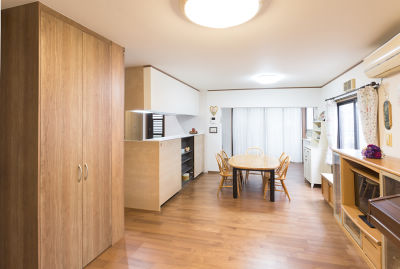 定年をきっかけに「明るく、風通しの良いLDKにリフォームしたい」とご希望されていたF様。壁付けだったキッチンは勝手口のある対面式に変更。ダイニングスペースを拡張し、天井には自動開閉式の天窓を設けることで、光が降りそそぎ、風の通り抜ける心地よいLDKが生まれました。明るく心地よいお部屋でご夫婦での会話も弾むと、奥様も納得の仕上がりとなったようです。