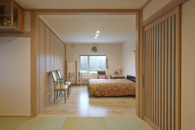 使われていない2間続きの和室を、明るくお客様もくつろげる空間にしたいとご希望されていたT様。間仕切りを撤去し、床の間など既存のしつらえは継承しながら、畳はモダンな琉球畳に変更しました。また収納の扉などは、新たにメープル材に貼り替え、暗かったお部屋も明るい印象に。押し入れだった収納も天井まであるクローゼットとし、広々とした空間に生まれ変わらせました。