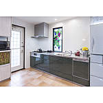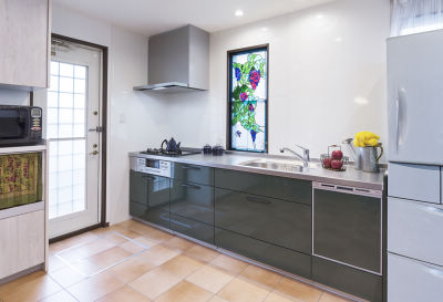 「ご夫婦でゆっくり食事できるスペースを」と、奥様憧れのキッチンをリフォームでプレゼントされたH様。対面式だったキッチンは、あえて壁付けのI型にすることで食事のできるダイニングスペースを確保。そのままでは壁を向いてお料理することになるからと、オーダーメイドのステンドグラスを埋め込み、奥様が気持ち良く調理できるように配慮されるなど、愛情いっぱいの空間になりました。