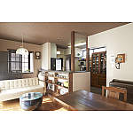 新築当時の流行だったカントリー調の空間に大好きな和の古家具を置くことに違和感をお持ちだったF様。閉塞感のあった独立型のキッチンは、垂れ壁と吊り戸棚を撤去してオープンに。あえて黒のタイル貼りとすることで、レトロな味わいが感じられます。そこからキッチンを中心に、土間を意識したフロア材やウォールナット色の塗装、天井の網代風クロスなど、和のヴィンテージテイストがふんだんに盛り込まれています。