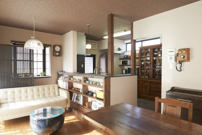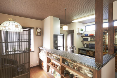 新築当時の流行だったカントリー調の空間に大好きな和の古家具を置くことに違和感をお持ちだったF様。閉塞感のあった独立型のキッチンは、垂れ壁と吊り戸棚を撤去してオープンに。あえて黒のタイル貼りとすることで、レトロな味わいが感じられます。そこからキッチンを中心に、土間を意識したフロア材やウォールナット色の塗装、天井の網代風クロスなど、和のヴィンテージテイストがふんだんに盛り込まれています。