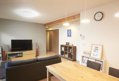 ご夫婦で絵画コレクションが趣味のU様。耐震補強をきっかけに、長年ご夫婦で思い描いてきた理想の住まいを叶えたいと全面リフォームされました。既存の和室を解体して拡張されたLDKには、ダウンライトと化粧梁が演出するギャラリースペースが。その他にも玄関のピクチャーレールやカウンターなど、ご夫婦がコレクションしている版画や雑貨などを自由気ままにディスプレイして空間を演出できる、ギャラリーのような住まいになりました。