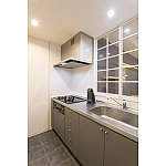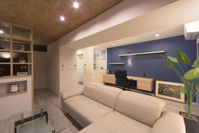 キッチンや浴室はあまり使われないというA様のご意向から、設備はほぼそのままに、キッチンの吊戸棚を撤去しリビング空間とキッチンの間に室内窓を設けました。調理時のにおいなどを遮断してくれる一方で、腰壁上から大きく開いた開口部は開放的で、窓から視界が抜けるため空間に広がりを感じるセミクローズな空間に仕上がっています。内装では、天井のコルク仕上げや書斎スペースのクロス、TV背面の塗り壁など、お部屋に豊かな表情を生んでいます。照明はあたたかみのある電球色を基調としながら、調光によってさまざまなシーンを演出。「寝室から音楽を聴きながらリビング・書斎を眺めるのがお気に入りの時間です」と、A様もご満悦。ひとつひとつのこだわりがお部屋に豊かな表情を与え、大人の時間を楽しむ上質なリラックス空間となりました。