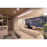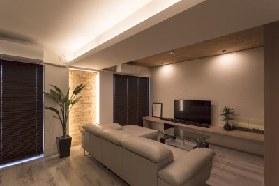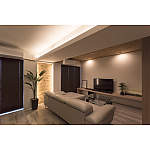 点検口などマンションならではの問題を間接照明で解決するアイデアが見事。高級感と温かみのある落ち着いた空間になっています。