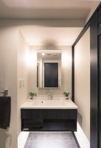 生活感が出がちな洗面台はデザイン重視の「見せる洗面」に。