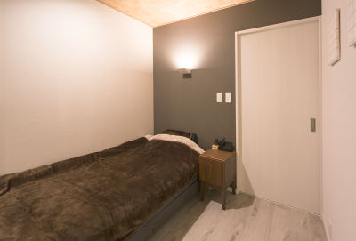 数が多く、使い勝手が良くないため、間仕切りを撤去したシティホテルのようなワンルームへと間取りを変更。一室の中にリビングと書斎コーナー、寝室コーナーをそれぞれ設けました。リビング横にあったエアコンの点検口は、壁をふかして目隠し。そこに設けたニッチに石調のタイルを貼り、間接照明を仕込んでラグジュアリーなお部屋のアクセントとしました。また、寝室コーナーとリビングの間には格子棚になった間仕切りを新たに設置。風の流れを遮ることなく、空間をほどよくセパレートしています。照明のレイアウトも、光が直接目に入らないよう器具や位置にも考慮し、くつろぐスペースとなっています。