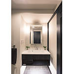 数が多く、使い勝手が良くないため、間仕切りを撤去したシティホテルのようなワンルームへと間取りを変更。一室の中にリビングと書斎コーナー、寝室コーナーをそれぞれ設けました。リビング横にあったエアコンの点検口は、壁をふかして目隠し。そこに設けたニッチに石調のタイルを貼り、間接照明を仕込んでラグジュアリーなお部屋のアクセントとしました。また、寝室コーナーとリビングの間には格子棚になった間仕切りを新たに設置。風の流れを遮ることなく、空間をほどよくセパレートしています。照明のレイアウトも、光が直接目に入らないよう器具や位置にも考慮し、くつろぐスペースとなっています。