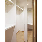 収納不足の解消のため、大容量のウォークインクローゼットを新設。季節の衣類や生活用品が一度に収納できます。またクローゼット側の壁部分や引き戸などの木製の縦格子のデザインは、空間に統一感を与える工夫。採光としての機能も兼ねており、やわらかい光を取り入れながら和モダンの雰囲気を高めています。