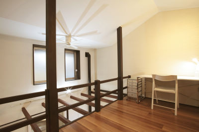 吹抜は梁がアクセントになり、1階とのつながりを印象的に演出。