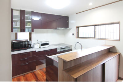 ダイニング側の吊度を無くし、開放感のあるキッチンへ変身。ご家族の顔を見ながら楽しく料理が出来ます。