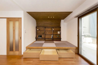 寝っ転がったり、洗濯物をたたんだり、子どもと遊んだりできる畳の小上がり。足を下ろしてパソコンや読書もでき、大活躍のコーナーです。畳下にも大容量の収納を確保。