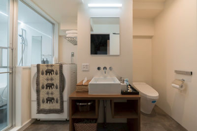 トイレは洗面室と一緒にした省スペース設計。バスルームはガラス壁にして、マンションにありがちな暗く狭い雰囲気を解消しました。