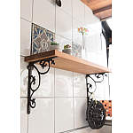 調理スペース前は、無垢板×アイアンの飾り棚で機能とおしゃれ感を演出。清潔感ある白タイルにアンティークなアクセントを効かせて落ち着きを。