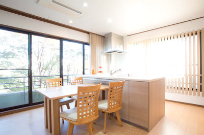 木目調の温もりあふれるダイニングキッチン。大きな窓からの眺めも最高です。