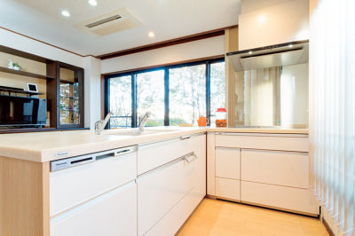木目調の温もりあふれるダイニングキッチン。大きな窓からの眺めも最高です。