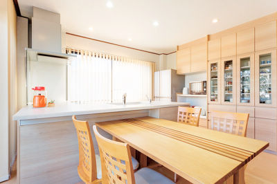 長年ひとつのキッチンを二世帯で使われていた奥様のために、「感謝の気持ちを込めてお気に入りの空間を」と、ご主人からプレゼントされたリフォーム。使われていなかった2階の書斎をダイニングキッチンに変更しました。木目調のあたたかみのある空間にL字型のキッチンを設け、スムーズな家事動線も確保。「とてもお料理がしやすい。自分のお城ができたようで嬉しいです」と奥様も大満足。また、掃除がしやすいようにと、洗面などの水まわりも見直しました。