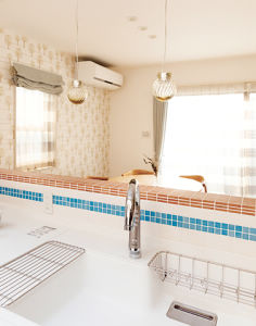 カウンターの立ち上がりが目隠しになり、空間をすっきりと演出。青と白のタイルは奥様のセンス。清潔な印象に。