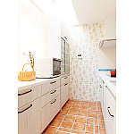 ご家族がほとんどの時間をリビングで一緒に過ごすというT様邸では、2匹のワンちゃんもその一員。リフォームをする際も、愛犬たちが滑らないよう床は凹凸のあるものを選び、リビングの一角にはタイル張りのひんやりエリアを設けました。お子さんがリビングでも勉強できるように、キッチンの対面壁前にはカウンターを設置。使われていなかった洋室を広げ、リビングをより快適な空間へとつくり替えました。