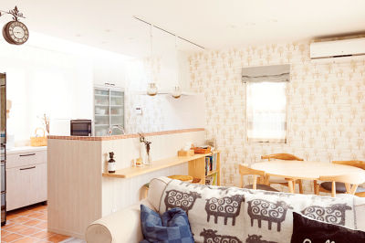 ご家族がほとんどの時間をリビングで一緒に過ごすというT様邸では、2匹のワンちゃんもその一員。リフォームをする際も、愛犬たちが滑らないよう床は凹凸のあるものを選び、リビングの一角にはタイル張りのひんやりエリアを設けました。お子さんがリビングでも勉強できるように、キッチンの対面壁前にはカウンターを設置。使われていなかった洋室を広げ、リビングをより快適な空間へとつくり替えました。
