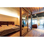 ガラスに木枠の引戸で開放感を、天井を一段下げてこもれる空間に。ベッドは、ご主人が近くの工場で手に入れたパレットを組み上げてDIYしたもの。