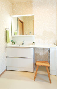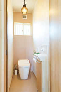 アンティーク風の照明器具に合わせた和風のイメージのトイレ、濃いめの木目で落ち着いた雰囲気の浴室、花柄模様の壁の可愛らしい洗面室。個々にイメージの異なる水まわりに、「雰囲気が変わって面白い」とご夫婦も大満足です。