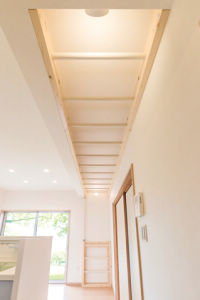 天井脇にかけられた雲梯。遊び盛りの小学生のお子さんのために、ご主人のリクエスト。