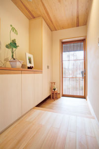 玄関から風が通り抜けるよう格子網戸を設え、床には水に強く素材感が魅力のクリの木を使用。