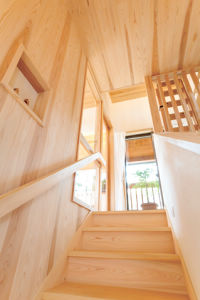 玄関に設えた格子網戸からは風が通り、1階の床と外壁、屋根の断熱材を使用し、夏は涼しく冬はあたたかい、地球にも体にもやさしい住まい。勾配を緩やかにし、昇り降りがラクになった階段を昇ると、光や風とともにテラスの植栽がお出迎え。天井や床に使用された杉やヒノキの天然素材も心地よく、省エネにも一役買っています。