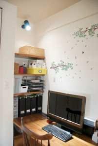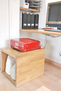 カウンター左下部は、プリンターを収める奥行で設計。大工さんお手製のキャスター付きキャビネットです。