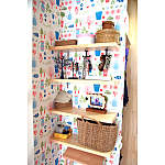 和室は薄暗く、上手くスペースを活用できず、お悩みでした。思い切って和室をファミリークロークとし、収納するものに合わせた棚の奥行を設定しました。換気の為、来客時以外は開放しておく事がおおいので、内部のクロスも単調なものではなく、大胆な柄物を選定しています