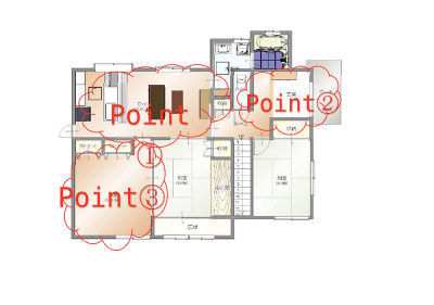 ポイント①LDKが広くなり、キッチンからテレビを見ながら料理ができるのがうれしい、洗面、お風呂への動線も非常に便利です。