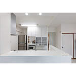シンクまわりの壁と吊り戸棚を撤去することで、明るく開放的なキッチンに。