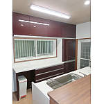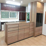 垂れ壁の吊り戸棚は背が高くて使いづらく、欲しい所に収納スペースがない。シンク横に食洗機を置いて使用していました。