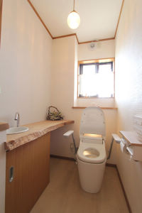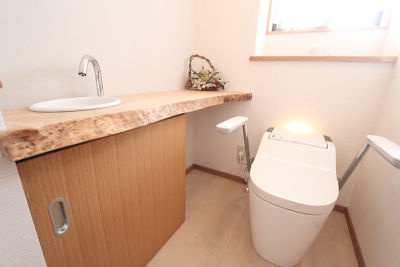 将来を見据えアームレスト付のトイレに 無垢カウンターがお部屋のアクセントに