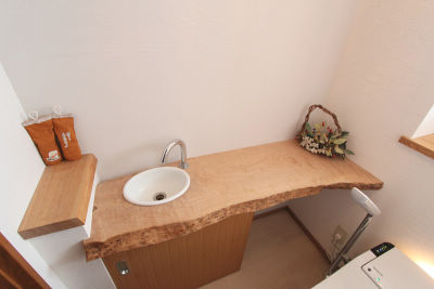 将来を見据えアームレスト付のトイレに 無垢カウンターがお部屋のアクセントに