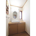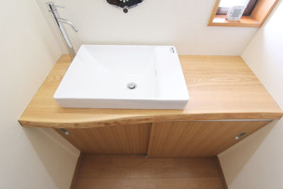 洗面カウンターは一枚板でご夫婦が選んだこだわりのひとつ